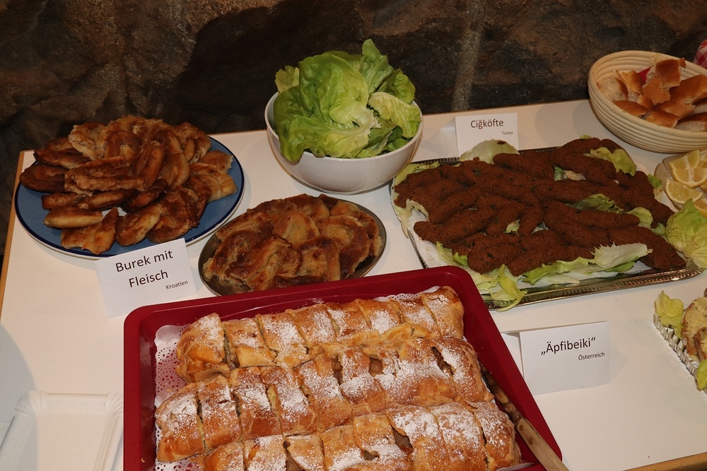 SchülerInnen und Eltern der Neuen Mittelschule Schärding boten in der Pause Kostproben aus ihrem internationalen Kochbuch an. Köstlichkeiten aus Fairem Handel gab es vom Weltladen Schärding.